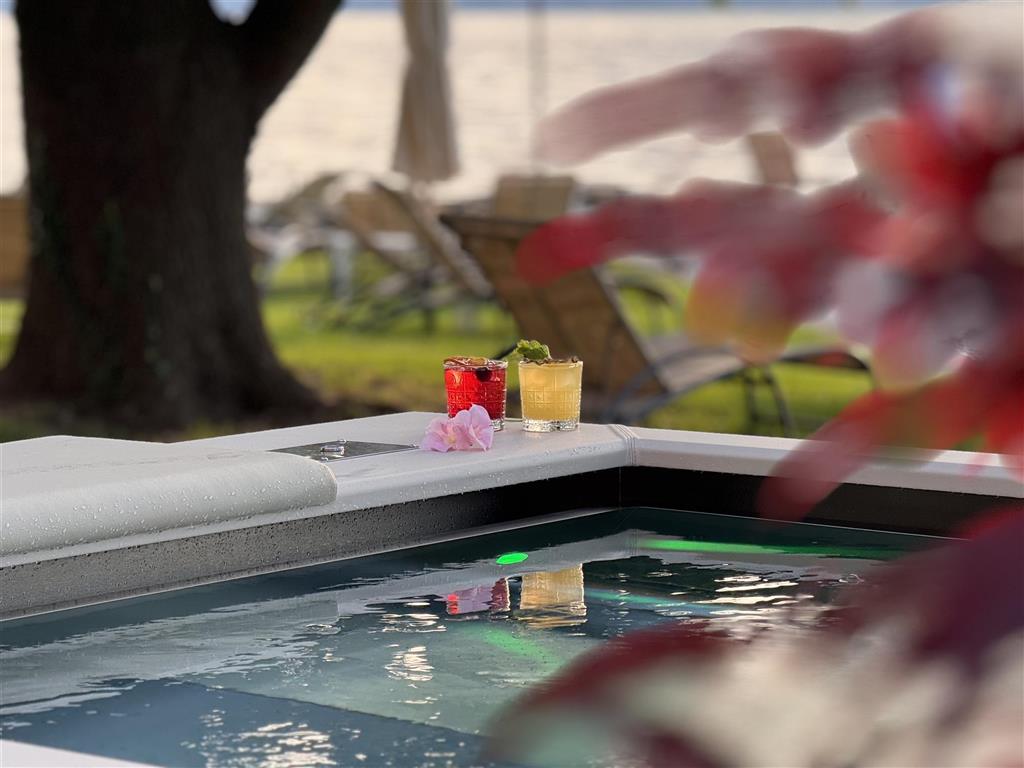 In our flowery garden, right by the beach we put at your disposal without charge chaise longues with sun covers, while in the meantime the ones who want to space stillness with some sport, they can use our own all weather tennis court and our heated indoor swimmimng pool 28°.