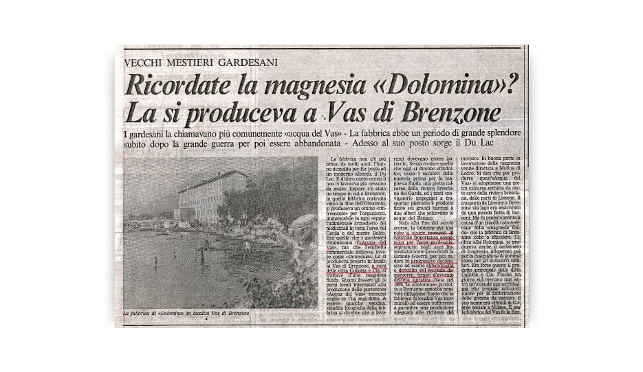 In one of the most beautiful glimpses of Lake Garda originally stood the fluid magnesia factory Dolomina, known as "Acqua del Vas" produced by the Collotta e Cis company, whose motive power was produced precisely by a rich source still existing - you can see it in the Beauty area!