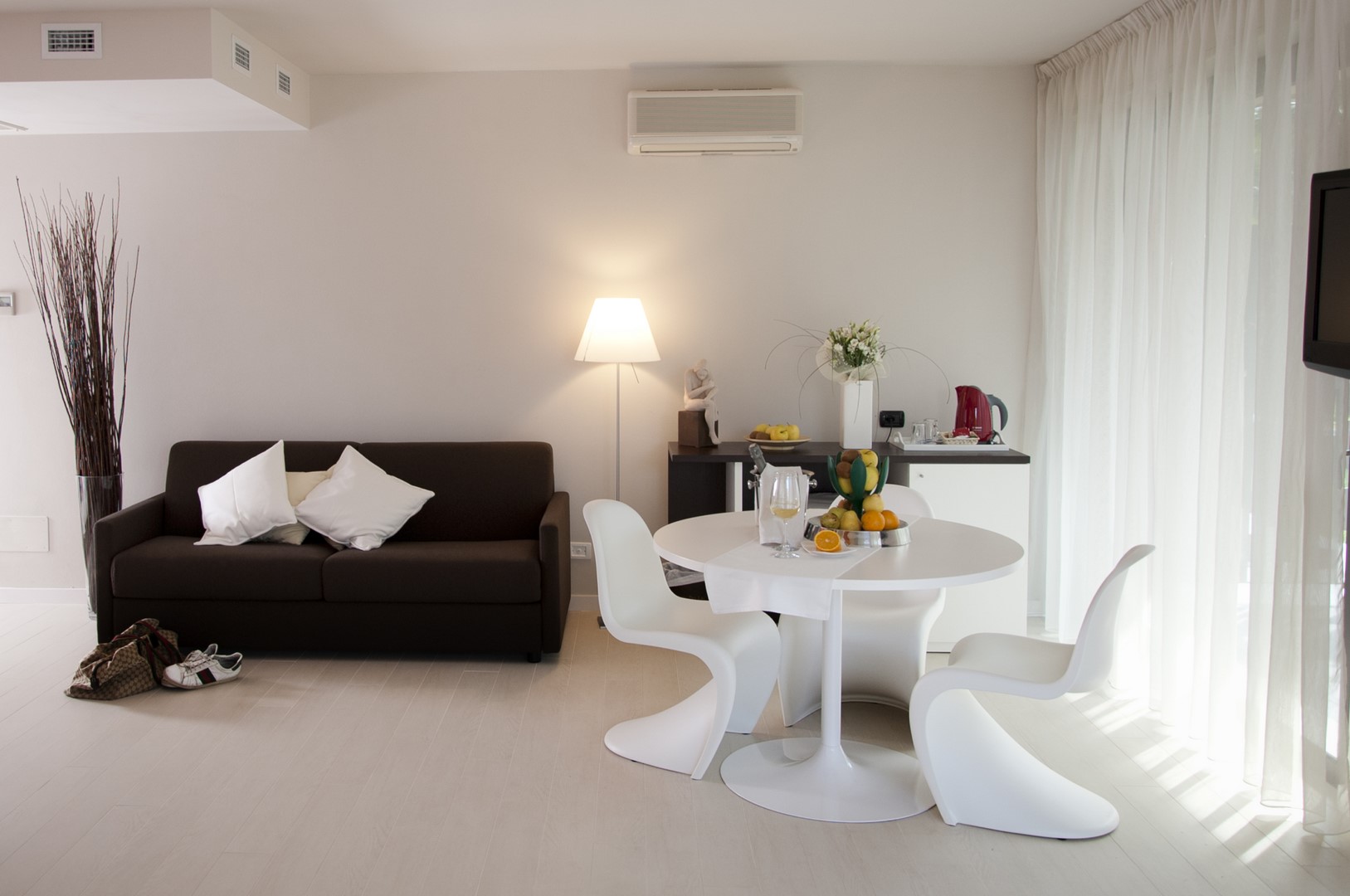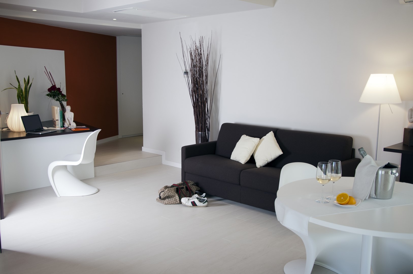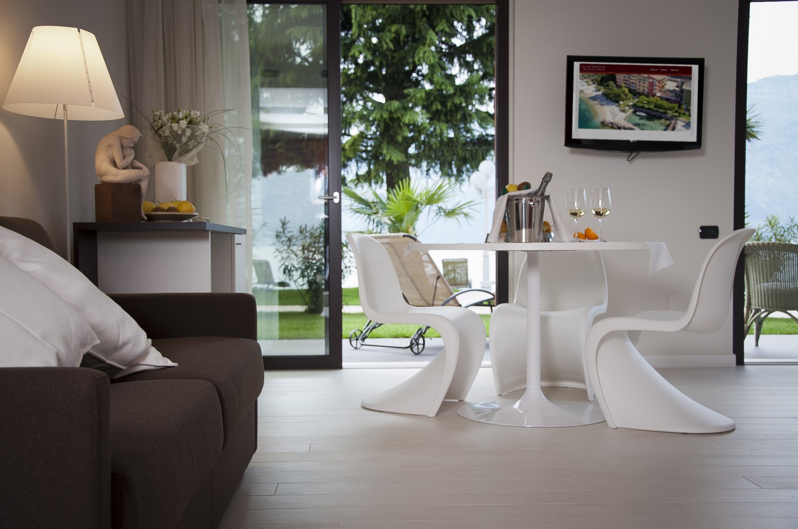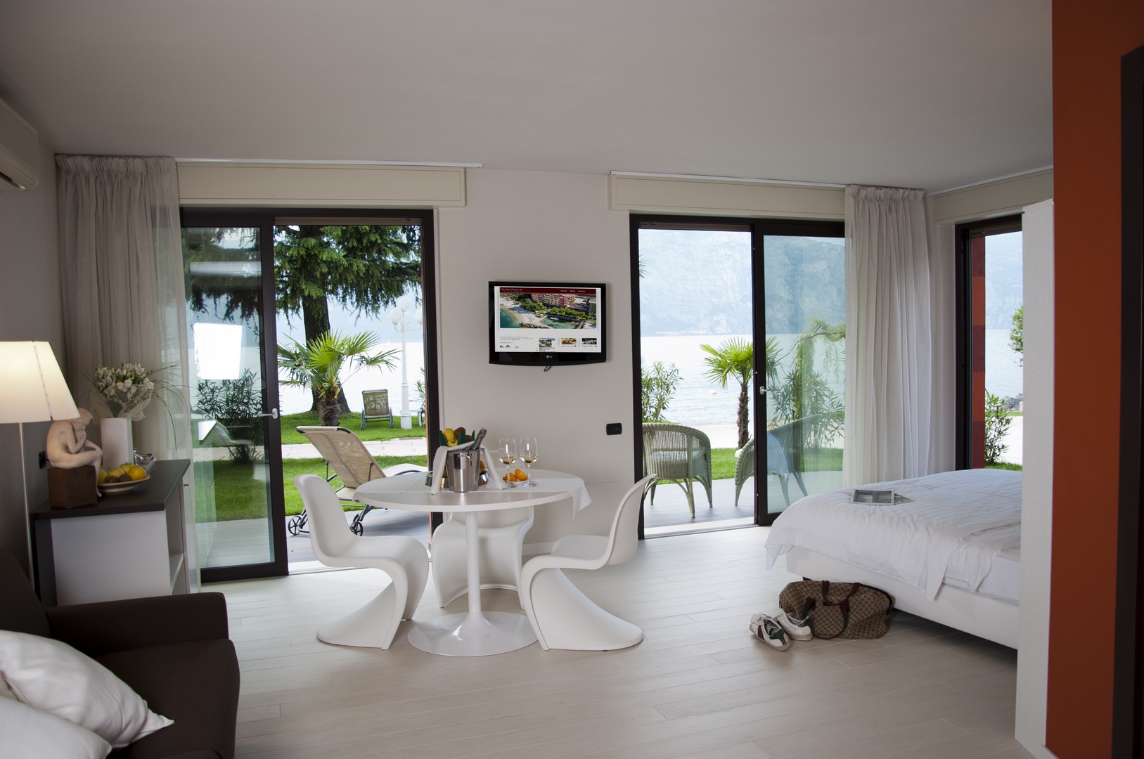 New, spacious total-white suite with ist flowery, peaceful garden & acces to the beach away from the noise of the Gardesana street. New, spacious blue marble bathroom layout with a living area and terrace directly to the lake with all the newest amenities; free use of a soft beach towel for the beach and kettle to make tea and coffee.