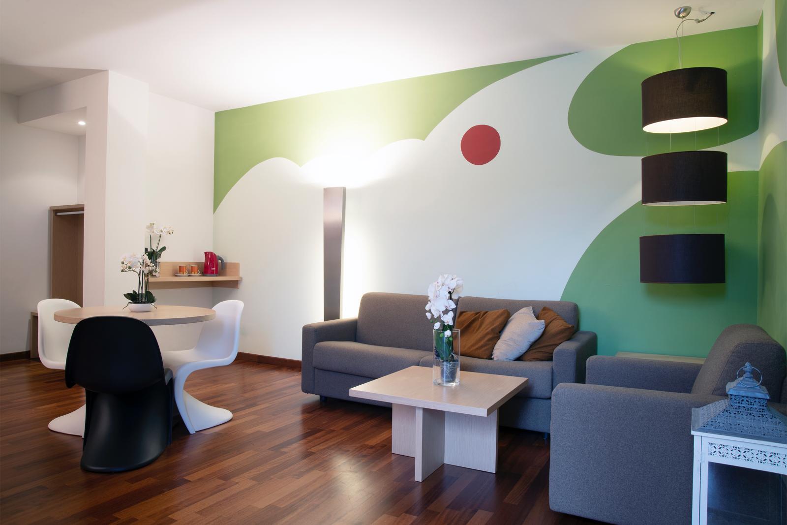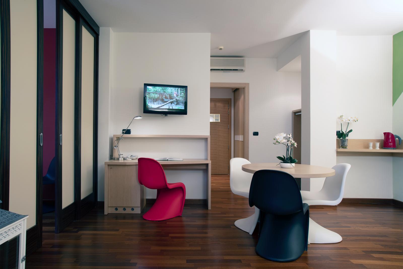 Modern and spacious (37/43qm) and conditioned suite with living room and separate sleeping room; it has a terrace with private sunchairs with view directly to the lake - no street between your room and the lake. Minibar, plasma Sat TV, safe, telephone, free WIFI; free use of a soft beach towel for the beach and kettle to make tea and coffee.