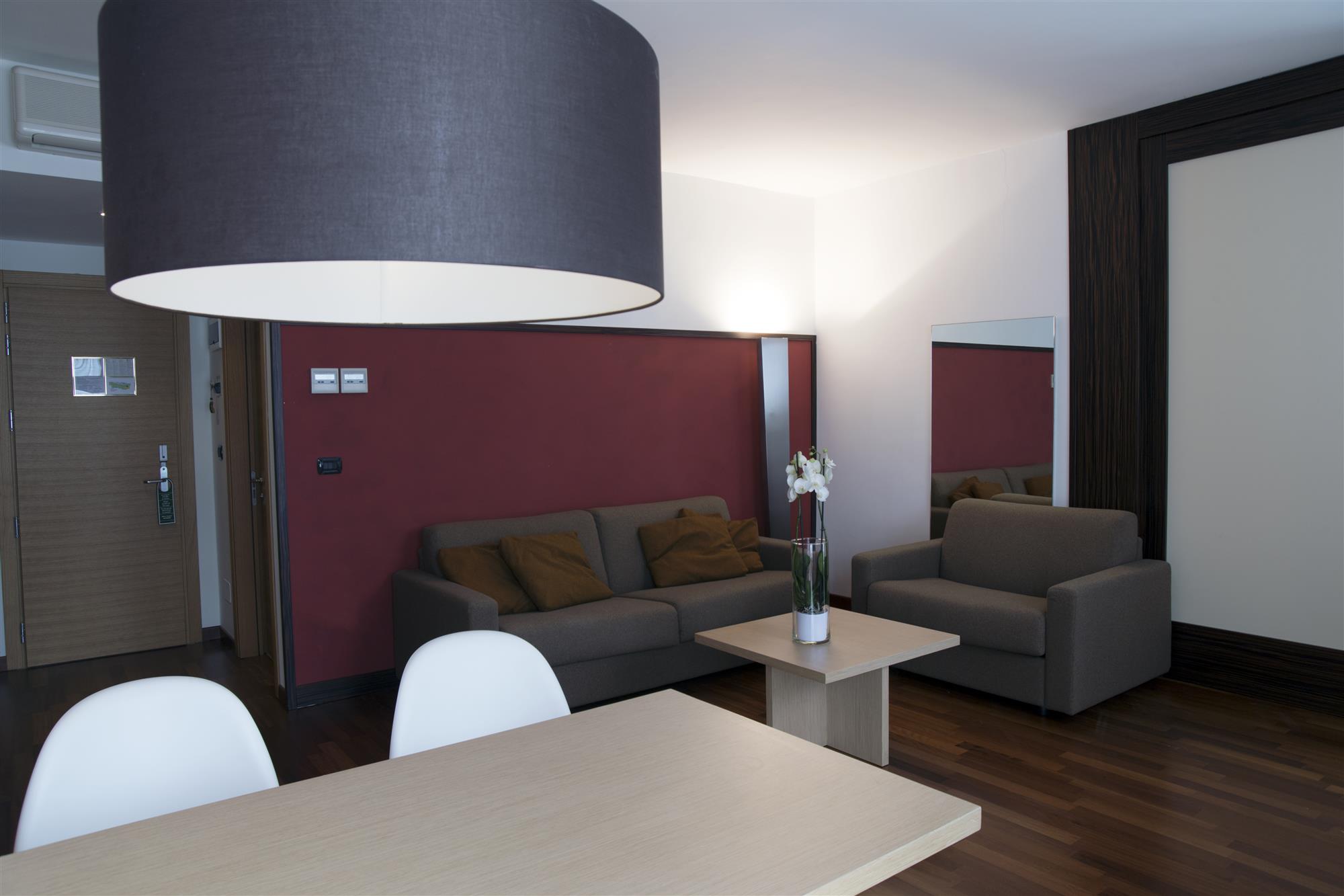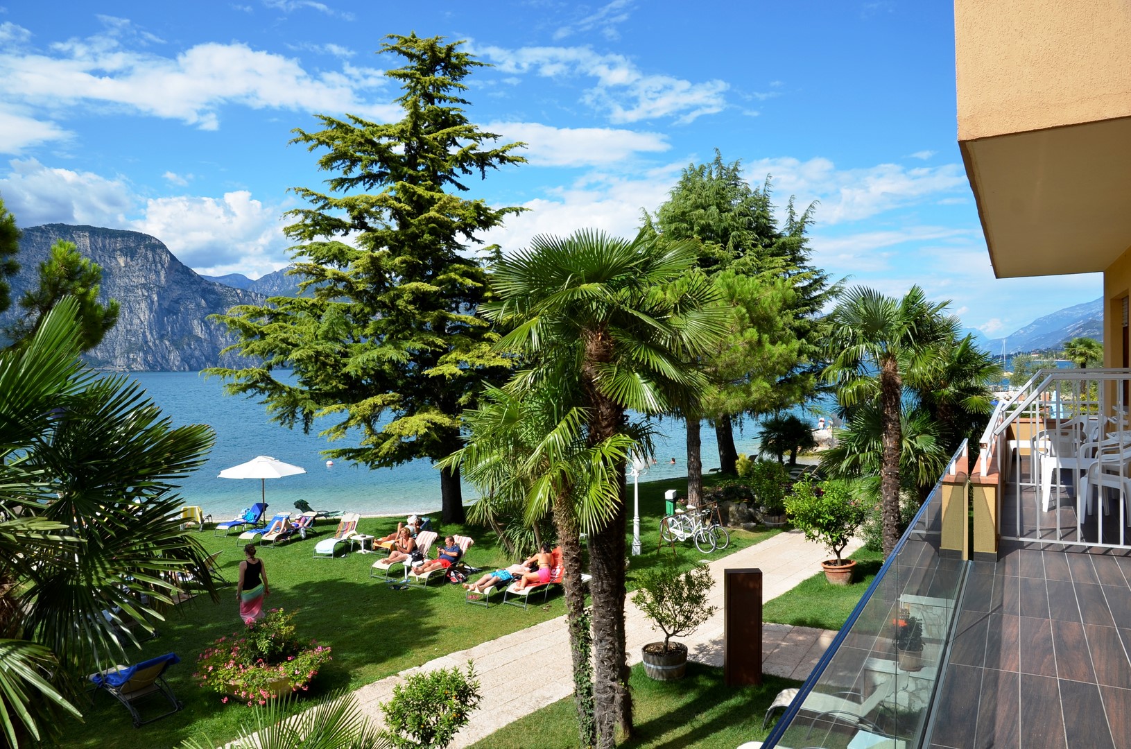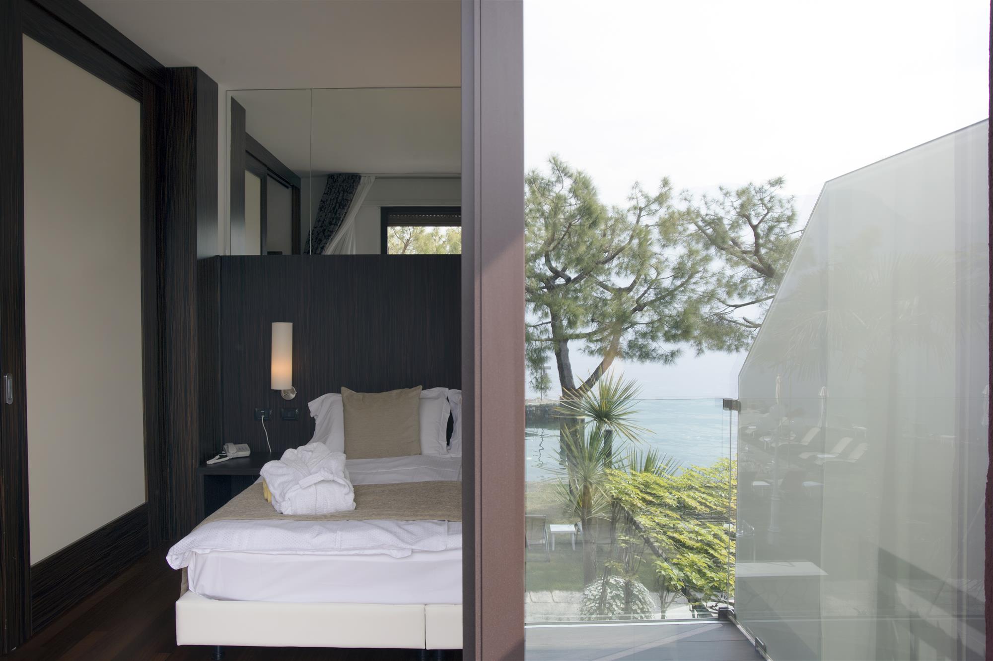Modern and spacious (37/43qm) conditioned room with a living room and separate sleeping room; It has a big glass balcony to the lake - no street between your room and the lake. Free use of a soft beach towel for the beach and kettle to make tea and coffee.
